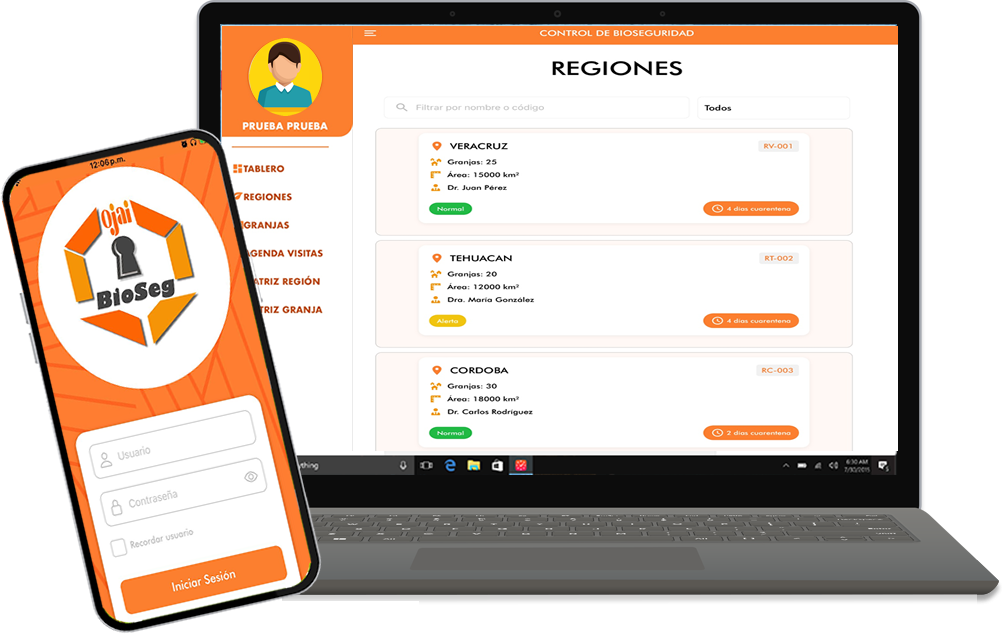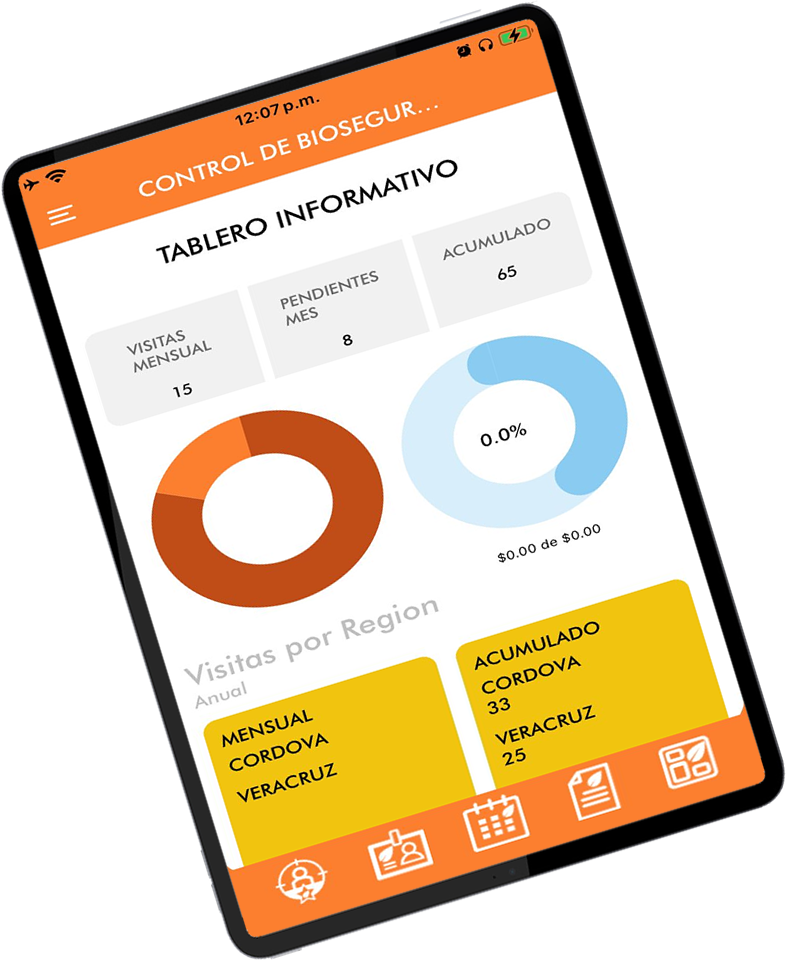 Acceso a información detallada sobre cada visita incluyendo fecha, hora y estado.. Consulta las Regiones, Granjas y relacion de matriz de bioseguridad